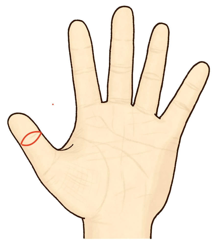 親指の第一関節のしわに“目のような形”が出る珍しい相です。